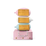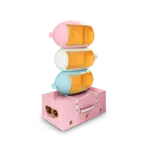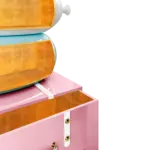 The Skybound Bookcase defies the geometry of conventional shelving. Three organic, biomorphic volumes — each a different pastel tone, each a different scale — are stacked with a formal eccentricity that is closer to sculpture than to furniture. Yet within each volume, the proportions are precisely calibrated for function: every shelf is scaled to receive books, objects, and treasured things with the generosity of a piece that understands what storage is actually for.